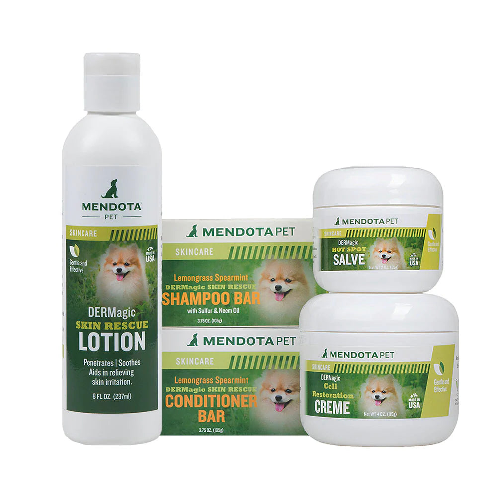 System Kit: Includes a Skin Rescue Shampoo bar, Skin Rescue Conditioner bar, 237ml bottle of Skin Rescue Lotion (LARGE, 55g jar of Hot Spot Salve, and 115ml jar of Cell Restoration Creme